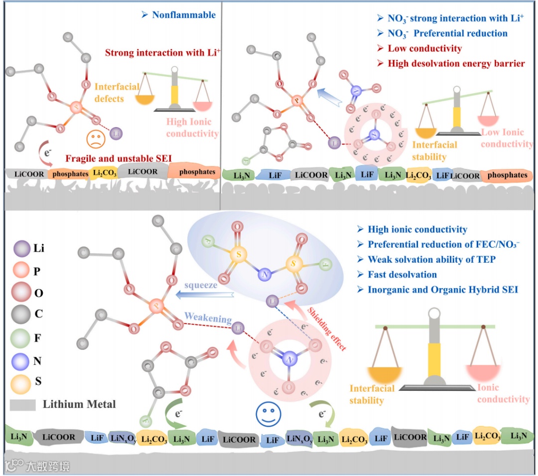 本文针对锂金属电池中磷酸盐基电解质面临的界面稳定性与体相离子电导率相互制约的核心难题,提出了一种创新的双阴离子耦合竞争配位策略,成功实现了二者协同优化。通过LiNO3与LiFSI的巧妙盐组合,在常规浓度下构建了“阴离子锚定”式溶剂化结构。其中NO3−凭借强配位能力进入Li+主溶剂化鞘,而FSI⁻则协同形成空间位阻较大的溶剂化鞘,有效削弱了磷酸酯溶剂的配位强度,同时适度弱化了Li+-NO3−的强结合,从而兼顾了界面稳定与离子传输。