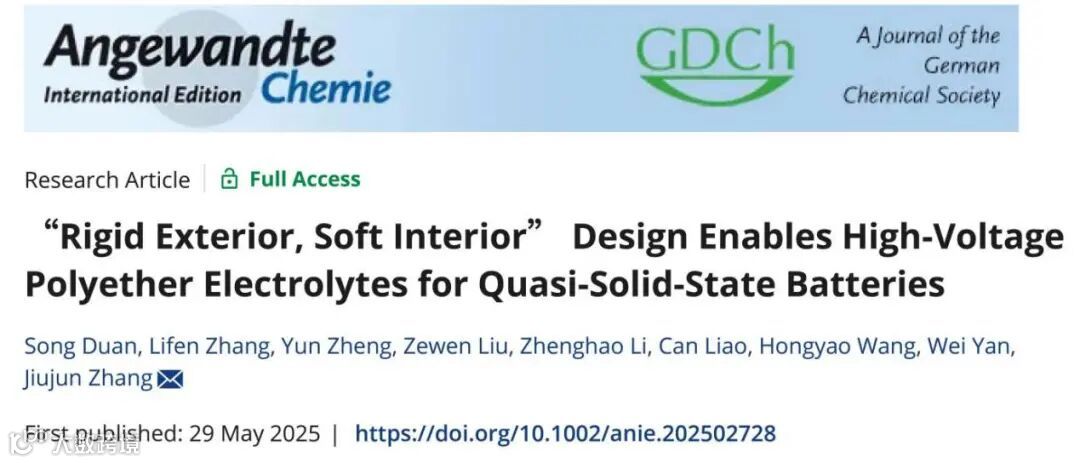 S. Duan, L. Zhang, Y. Zheng*, Z. Liu, Z. Li, C. Liao*, H. Wang, W. Yan, J. Zhang*, “Rigid Exterior, Soft Interior” Design Enables High-Voltage Polyether Electrolytes for Quasi-Solid-State Batteries”, Angew. Chem. Int. Ed. 2025, e202502728.