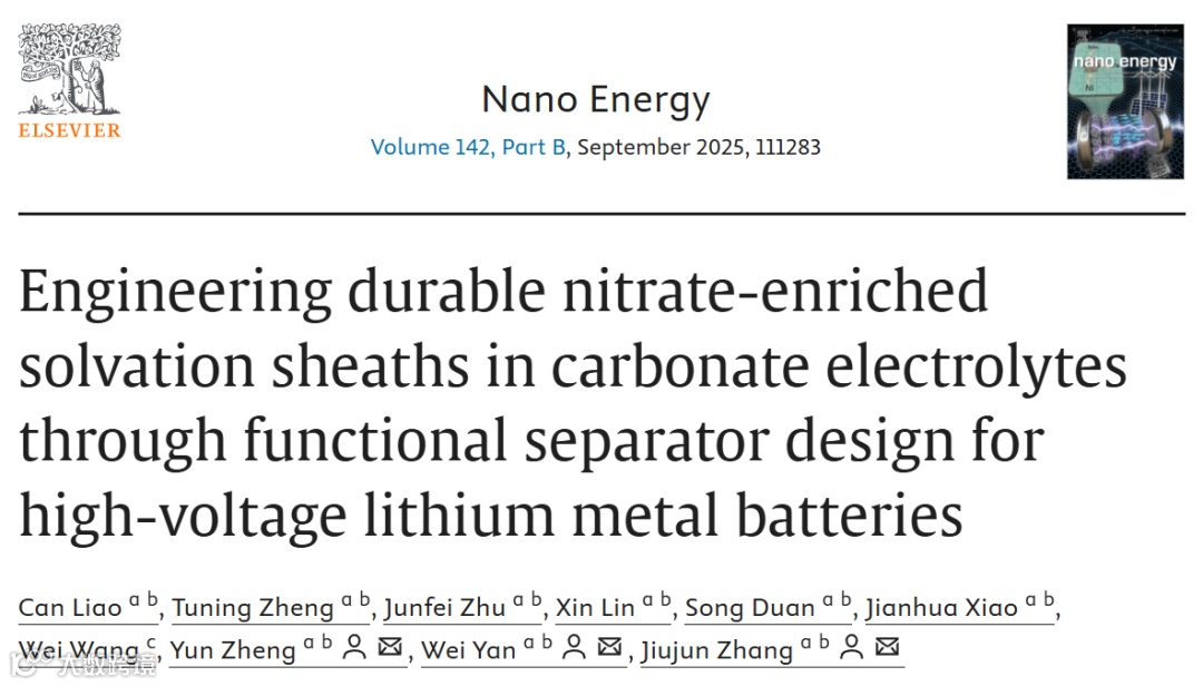C. Liao, T. Zheng, J. Zhu, X. Lin, S. Duan, J. Xiao, W. Wang, Y. Zheng*, W. Yan*, J. Zhang*, “Engineering Durable Nitrate-Enriched Solvation Sheaths in Carbonate Electrolytes Through Functional Separator Design for High-Voltage Lithium Metal Batteries”, Nano Energy, 2025, 142, 111283.