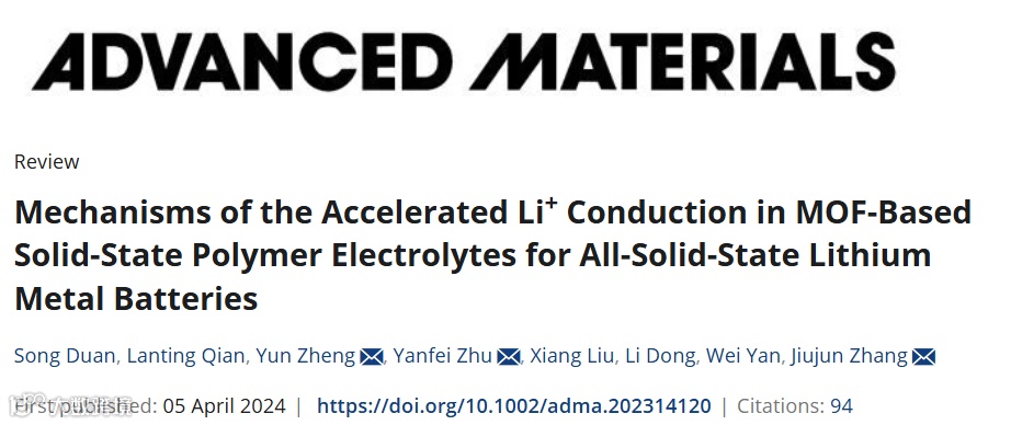 S. Duan, L. Qian, Y. Zheng*, Y. Zhu*, X. Liu, L. Dong, W. Yan, J. Zhang*, “Mechanisms of the Accelerated Li+ Conduction in MOF-Based Solid-State Polymer Electrolytes for All-Solid-State Lithium Metal Batteries”, Adv. Mater. 2024, 36, 2314120.