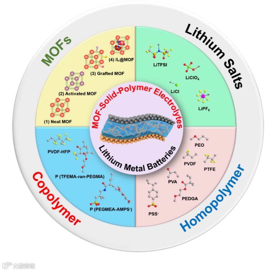 固态锂金属电池(SSLMBs)采用固态电解质替换传统商用锂离子电池中具有挥发性的有机液态电解质并匹配锂金属负极,可以有效提高电池的能量密度和安全性,相关研究受到了学术界和工业界的广泛关注。作为固态电池的重要组成部分,固态电解质(SSE)的研究尤为关键。其中,固体聚合物电解质(SPEs)由于具备低成本、灵活性、可扩展性、轻量化以及与电极之间的良好界面兼容性等优势,被认为是具有商业化前景的重要选择。目前该类电解质面临锂离子(Li+)室温电导率不足的关键挑战。大量研究表明,将金属有机骨架材料(MOF)引入到SPEs中形成MOF基固态聚合物电解质(MSPEs)是提高离子电导率的有效策略。考虑到MOF的多样性及对应MSPEs结构和成分的差异性,Li+在MSPEs中的传导机制非常复杂,MOF对Li+传导的促进机理尚不清楚,相关问题的研究和梳理是该类先进固态电解质研究的基础和关键。