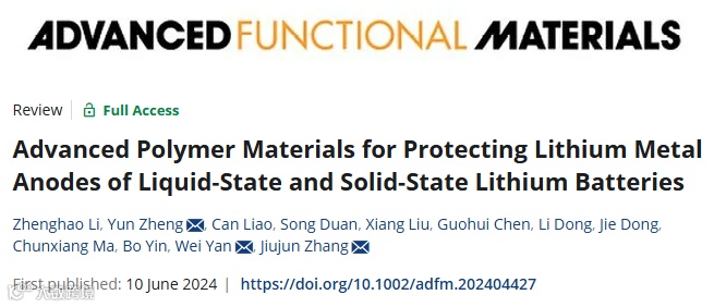 Z. Li, Y. Zheng*, C. Liao, S. Duan, X. Liu, G. Chen, L. Dong, J. Dong, C. Ma, B. Yin, W. Yan*, J. Zhang*, “Advanced Polymer Materials for Protecting Lithium Metal Anodes of Liquid-State and Solid-State Lithium Batteries”, Adv. Funct. Mater. 2024, 34, 2404427.