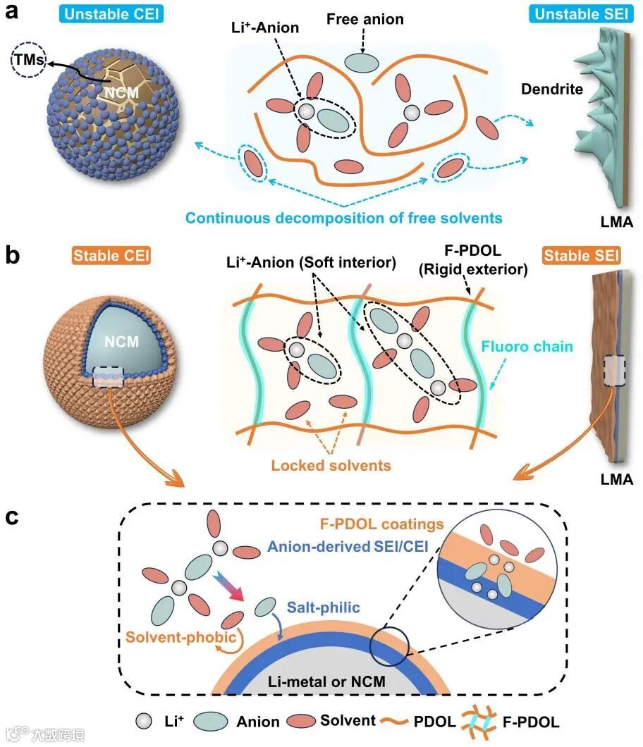(2)新型“选择透过性”界面膜:所设计的电解质在电池运行过程中,会在正负极表面诱导原位形成富含多氟基团的“亲盐疏溶剂”界面层,可有效促进稳定SEI和CEI的形成、有效抑制溶剂在电极界面的持续分解以及副反应,确保了高压锂金属电池的长期稳定运行。