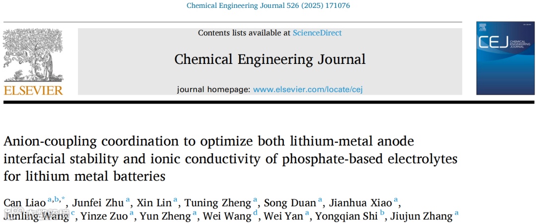 12. Chem. Eng. J.:阴离子配位耦合策略同步优化锂金属负极界面稳定性与磷酸盐基电解质离子电导率