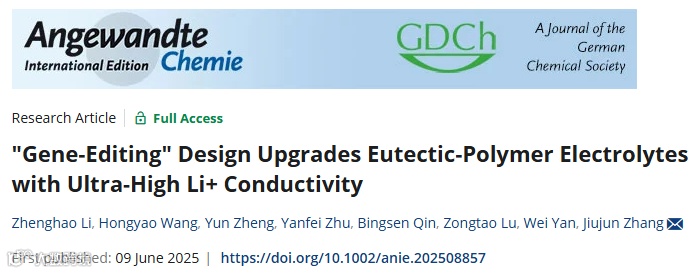 Z. Li, H. Wang, Y. Zheng*, Y. Zhu, B. Qin, Z. Lu, W. Yan*, J. Zhang*, “Gene-Editing Design Upgrades Eutectic-Polymer Electrolytes with Ultra-High Li+ Conductivity”, Angew. Chem. Int. Ed. 2025, e202508857.