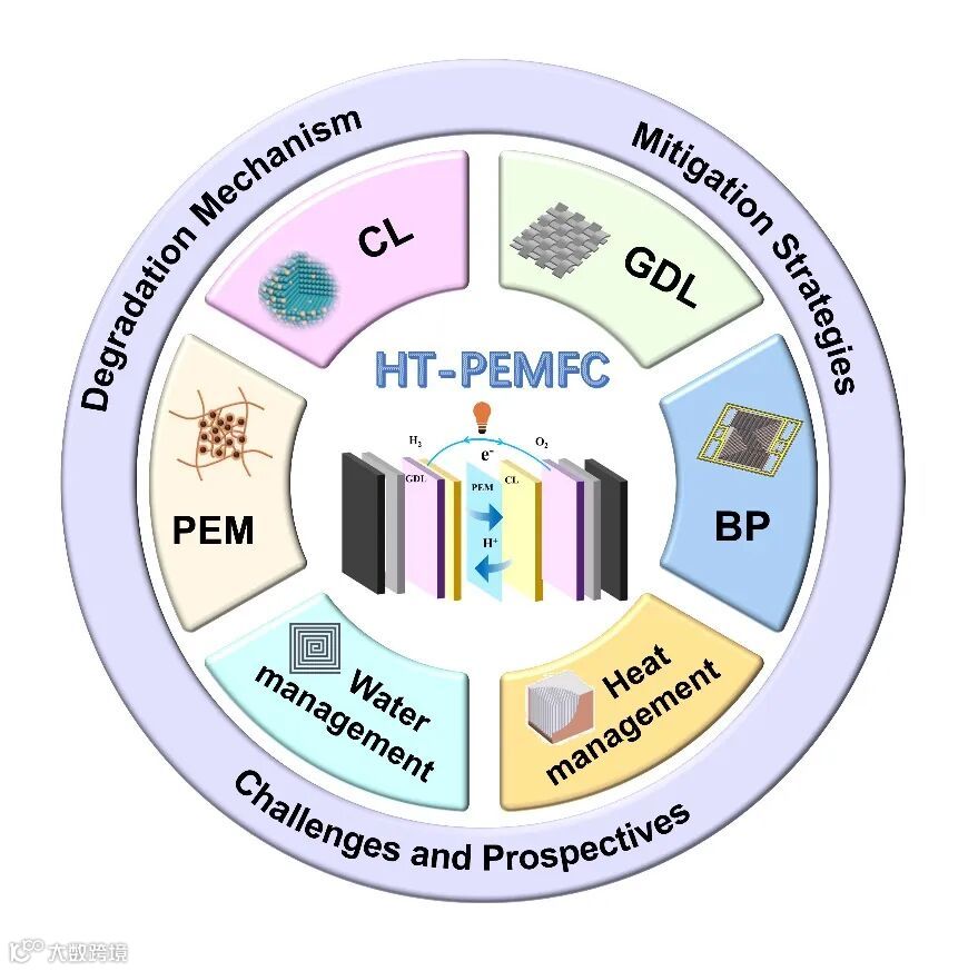 福州大学郑云教授和张久俊院士课题组对HT-PEMFC的失效机制和缓解策略进行了全面综述,对HT-PEMFC的关键组成部件进行了详细介绍。具体论述内容包括HT-PEMFC的反应原理、主要组成和发展历史等相关基础,质子交换膜(PEM)、催化层(CL)、扩散层(GDL)、双极板(BP)和热/水管理系统等关键部件的失效机制分析和针对性缓解策略,以及从基础理解到大规模应用等诸多方面提出的该领域当前面临的关键挑战和发展前景。