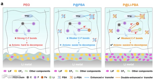 (2)新型负极/电解质界面稳定机制:通过结合多种表征技术与密度泛函理论(DFT)模拟计算等研究手段,系统揭示了富LiF SEI层的稳定机制。研究发现,“预锂化”策略双增强SPEs的锂盐中C-F键的分解是导致形成的SEI层中LiF比例显著升高的关键因素。这种富含LiF成分的SEI结构在界面处展现出双重优势:一方面,它增强了SEI层对Li⁺的吸附能力;另一方面,富LiF的SEI的形成有效降低了Li⁺在界面处的迁移能垒。这两种效应的协同作用,有效地防止了锂离子的局部积累和锂枝晶的形成。