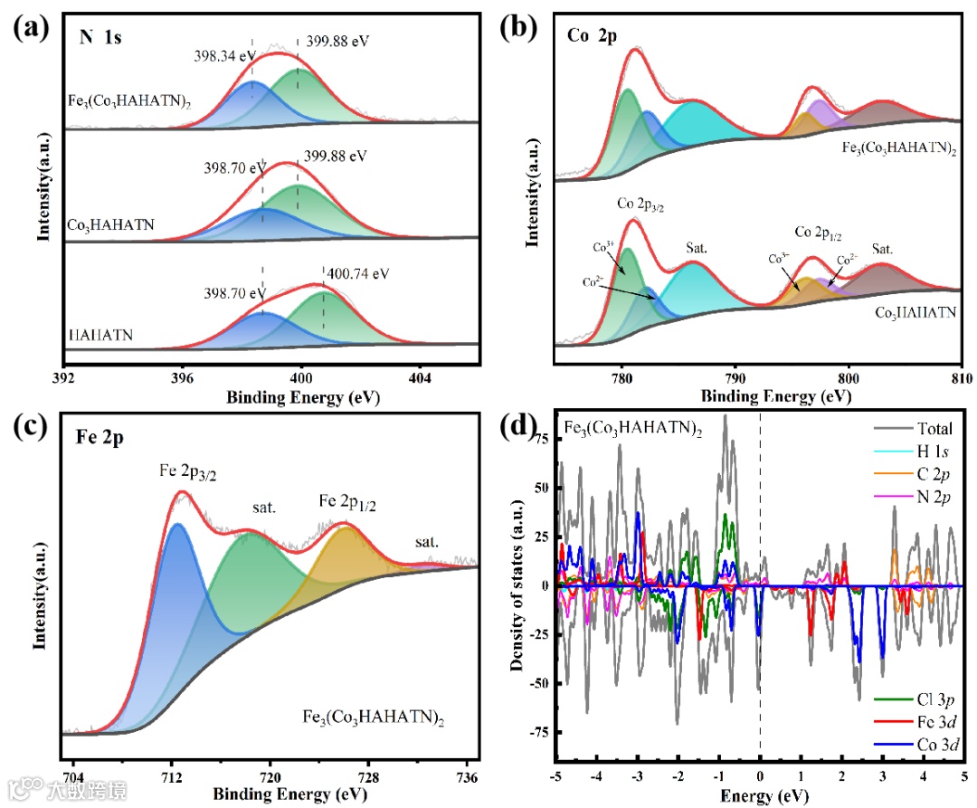 图4. (a) HAHATN、Co3HAHATN 和Fe3(Co3HAHATN )2的N 1s XPS谱图;(b) Co3HAHATN 和Fe3(Co3HAHATN )2的Co 2p XPS谱图;(c) Fe3(Co3HAHATN )2的Fe 2p XPS谱图;(d) Fe3(Co3HAHATN )2的总DOS图。