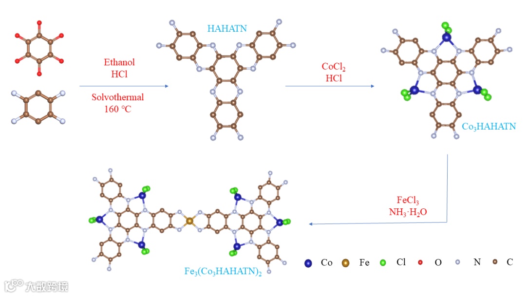 图1. Fe3(Co3HAHATN )2 的结构和合成流程图。
