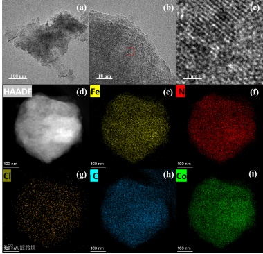 图2. Fe3(Co3HAHATN )2的(a,b) TEM图像和(c) HRTEM图像;(d-i) Fe3(Co3HAHATN )2的HAADF-STEM和元素mapping图,蓝色点为C,红色点为N,黄色点为Fe,绿色点为Co,橙色点为Cl。