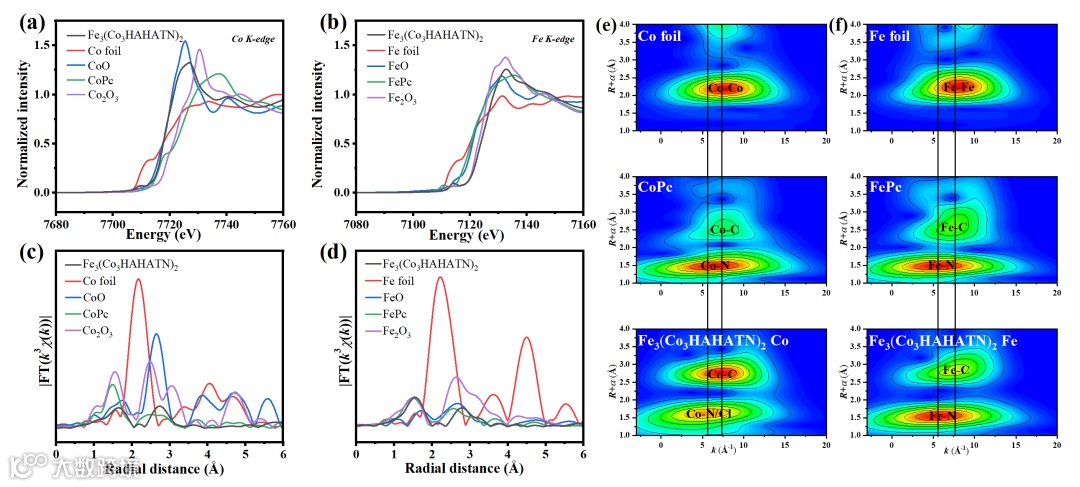 图3. (a) Fe3(Co3HAHATN )2、Co箔、CoO、Co2O3和CoPc的Co K-edge 归一化XANES谱图;(b) Fe3(Co3HAHATN )2、Fe箔、FeO、Fe2O3和FePc的Fe K-edge 归一化XANES谱图;(c) Fe3(Co3HAHATN )2、Co箔、CoO、Co2O3和CoPc的Co K-edge EXAFS傅里叶变换(FT)谱图;(d) Fe3(Co3HAHATN )2、Fe箔、FeO、Fe2O3和FePc的Fe K-edge FT-EXAFS谱图;(e) Co箔,CoPc和Fe3(Co3HAHATN )2的Co K-edge WT-EXAFS谱图;(f) Fe箔、FePc和Fe3(Co3HAHATN )2的Fe K-edge WT-EXAFS谱图。