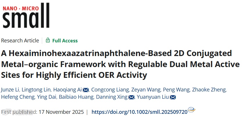 基于上述研究背景,我们选用具有双配位位点的六亚氨基六氮杂三萘(HAHATN)作为配体,通过调控反应体系 pH 值实现精准配位:酸性条件下,Co2+与 HAHATN 的菲啰啉氮位点配位,形成 Co3HAHATN 中间体;碱性条件下,Fe3+进一步与 Co3HAHATN 中的氨基位点配位,成功构建 Fe3(Co3HAHATN )2二维共轭金属有机框架(MOF)。该 MOF 展现出优异的电催化析氧反应(OER)性能,电流密度达到 10 mA cm-2 时的过电位仅为 220 mV。实验与密度泛函理论(DFT)计算结果共同证实, Fe3(Co3HAHATN )2的高催化活性源于 Fe-N4与 Co-N2Cl2双活性位点的协同作用。其中 Fe-N4位点更利于 OH⁻的吸附,而 Co-N2Cl2位点可有效降低反应决速步的自由能垒。该成果以“A Hexaiminohexaazatrinaphthalene-Based 2D Conjugated Metal-Organic Framework with Regulable Dual Metal Active Sites for Highly Efficient OER Activity”为题,发表在国际知名期刊《Small》上,该工作为合成具有可精准调控双金属活性位点的 π-d cMOFs提供了新思路。