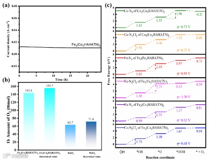 图6. (a) Fe3(Co3HAHATN )2在1.49 V vs . RHE 24h内的it曲线;(b) Fe3(Co3HAHATN )2和RuO2电极在1.54 V (vs. RHE)1h内的实际产氧量;(c) Co3(Co3HAHATN )2的Co-N4和Co-N2Cl2位点,Fe3(Fe3HAHATN)2的Fe-N4和Fe-N2Cl2位点以及Fe3(Co3HAHATN )2的Fe-N4和Co-N2Cl2位点的OER标准自由能图。