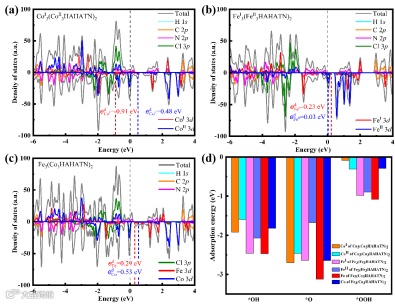 图7. (a) Co3(Co3HAHATN )2中Co-N4和Co-N2Cl2位点的d带中心能量;(b)Fe3(Fe3HAHATN)2中Fe-N4和Fe-N2Cl2位点的d带中心能量;(c) Fe3(Co3HAHATN )2中Fe-N4和Co-N2Cl2位点的d带中心能量;(d) Co3(Co3HAHATN)2、Fe3(Fe3HAHATN)2和Fe3(Co3HAHATN )2不同位点的吸附能。