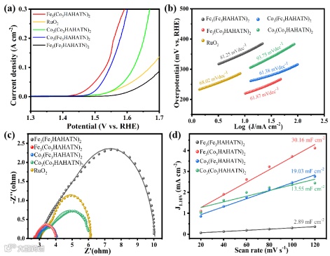 图5. Fe3(Fe3HAHATN)2,Fe3(Co3HAHATN )2,Co3(Fe3HAHATN)2,Co3(Co3HAHATN )2和RuO2的 (a) LSV曲线;(b) Tafel曲线;(c) EIS拟合曲线;(d)Fe3(Fe3HAHATN)2、Fe3(Co3HAHATN )2、Co3(Fe3HAHATN)2和Co3(Co3HAHATN)2的电化学双电层电容值表示的ECSA曲线。