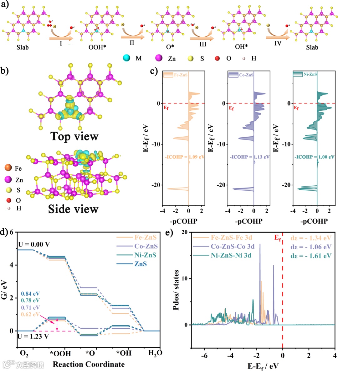 图6. a) O-OH、O及OH*在M-ZnS模型表面吸附的侧视图;b) Fe-ZnS的电荷密度差分图;c) 晶体轨道哈密顿布居曲线;d) 0.00 V 和1.23 V下的自由能图;e) 投影态密度图。