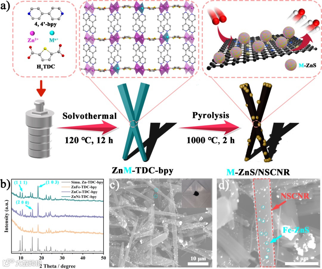 图1. a) M-ZnS/NSCNR系列材料(M = Fe、Co、Ni)的合成示意图;b) ZnM-TDC-bpy系列(M = Fe、Co、Ni)的PXRD谱图;c) ZnFe-TDC-bpy 和 d) Fe-ZnS/NSCNR的SEM图像。
