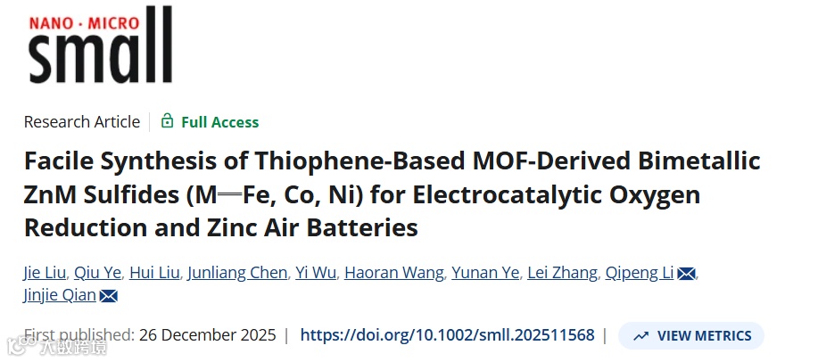 近日,来自温州大学的钱金杰副研究员与昭通学院的李启彭教授合作,在材料科学权威期刊Small上发表题为“Facile Synthesis of Thiophene-Based MOF-Derived Bimetallic ZnM Sulfides (M═Fe, Co, Ni) for Electrocatalytic Oxygen Reduction and Zinc Air Batteries”的研究论文。该工研究作利用双配体MOF中自身具备的硫源,无需外源硫直接碳化得到金属硫化物碳复合材料,并在此类MOF同构性的基础上,引入了电催化反应的活性元素,进而得到了掺杂的双金属硫化物(M-ZnS),在ORR和ZABs测试中表现出优秀的性能。