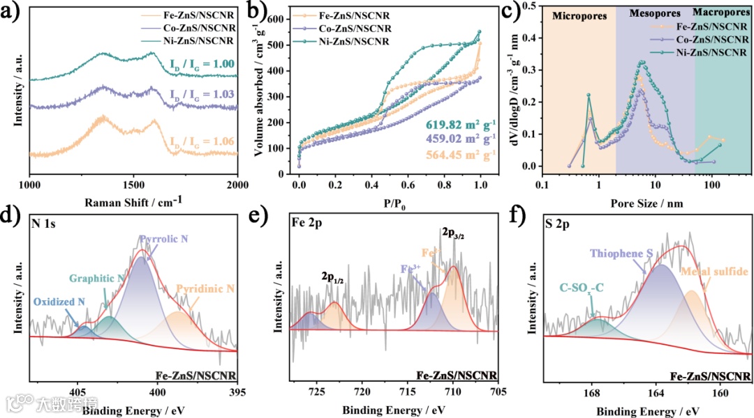 图3. a) M-ZnS/NSCNR的拉曼光谱;b) 氮气吸附-脱附等温线;c) 相应的孔径分布图;Fe-ZnS/NSCNR的去卷积XPS谱图:d) N 1s,e) Fe 2p,及 f) S 2p。