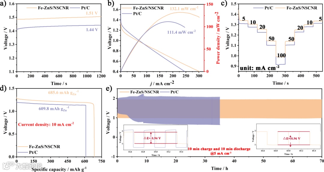 图5. a) 基于Fe-ZnS/NSCNR和Pt/C催化剂的可充电锌空气电池开路电压曲线;b) 放电极化曲线及相应的功率密度图;c) 不同电流密度下的放电平台;d) 恒电流放电曲线;e) 充放电循环曲线。