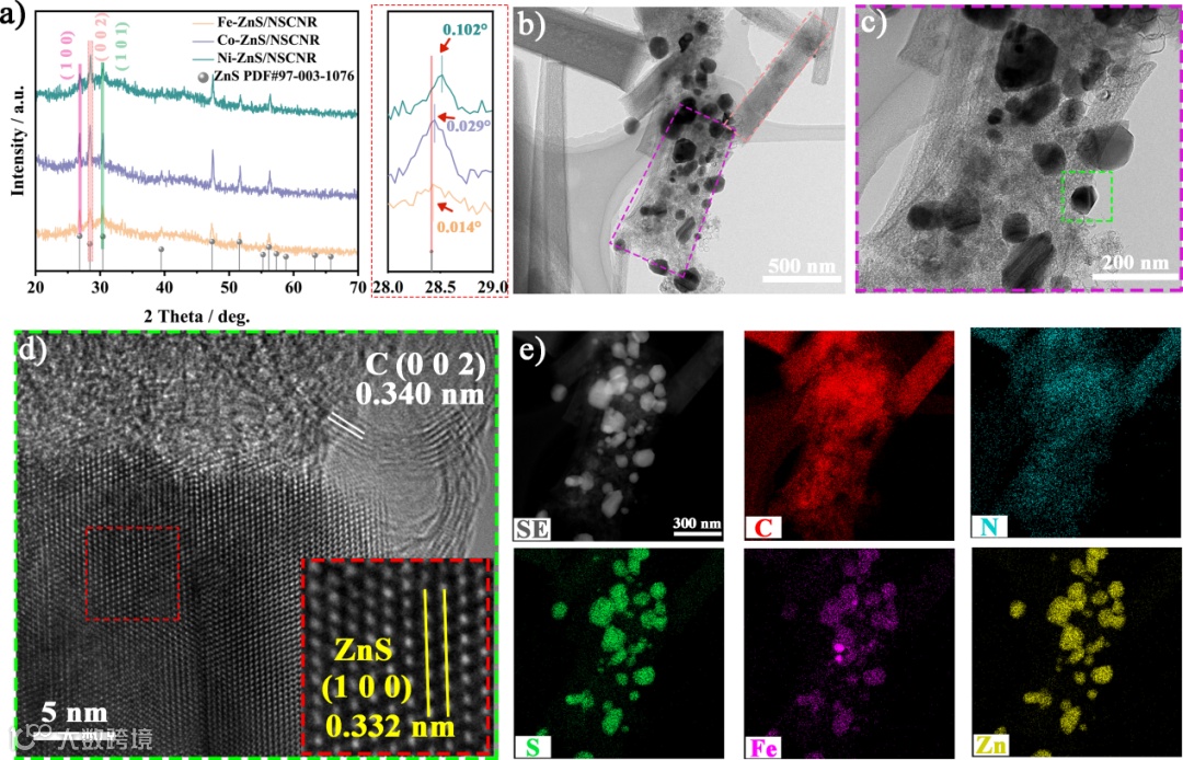 图2. a) M-ZnS/NSCNR的粉末X射线衍射图谱;b-c) Fe-ZnS/NSCNR的透射电子显微镜图像;d) Fe-ZnS/NSCNR单根纳米棒的高分辨透射电子显微镜图像及e) EDS元素分布图。