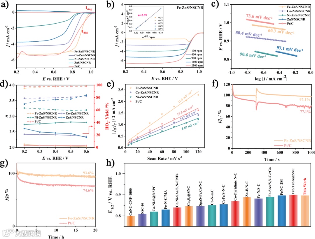图4. a) 不同ORR电催化剂在1600 rpm转速下测得的线性扫描伏安曲线;b) 不同转速下的LSV曲线;c) 塔菲尔斜率;d) 电子转移数(n)与过氧化氢产率;e) 双电层电容(Cdl)曲线;f) 甲醇耐受性测试;g) 长期耐久性测试;h) 与其他已报道的ORR电催化剂的半波电位对比。