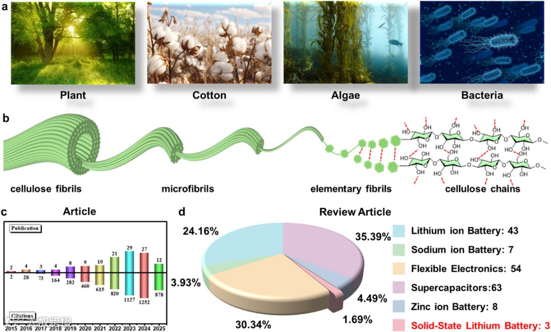 图1 (a)纤维素可从多种来源提取,包括植物、棉花、藻类和细菌。(b)从宏观到微观层面的纤维素结构多尺度示意图。(c)2015年至2025年SSLMB领域与纤维素相关的论文和引用数量。Web of Science数据:标题“纤维素”+主题“固态锂金属电池”。(d)2015年至2025年纤维素综述文章在不同领域中的相对比例。Web of Science数据:标题“纤维素”+主题“图中的应用类型”。