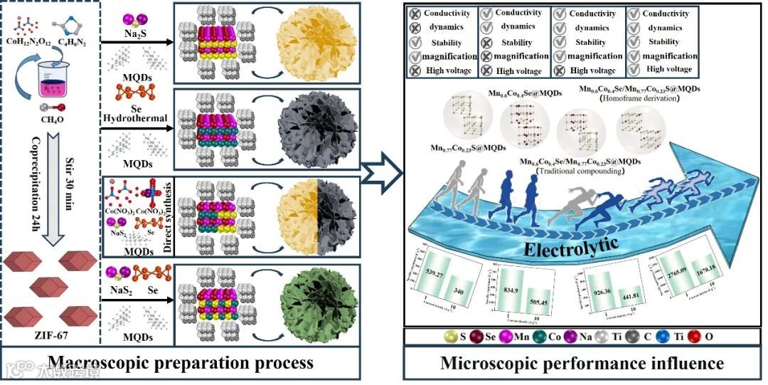 Fig. 1. Synthesis process and energy storage mechanism diagram of Co0.6Mn0.4Se/Co0.77Mn0.23S@MQDs with consistent space group and its contrast materials.
