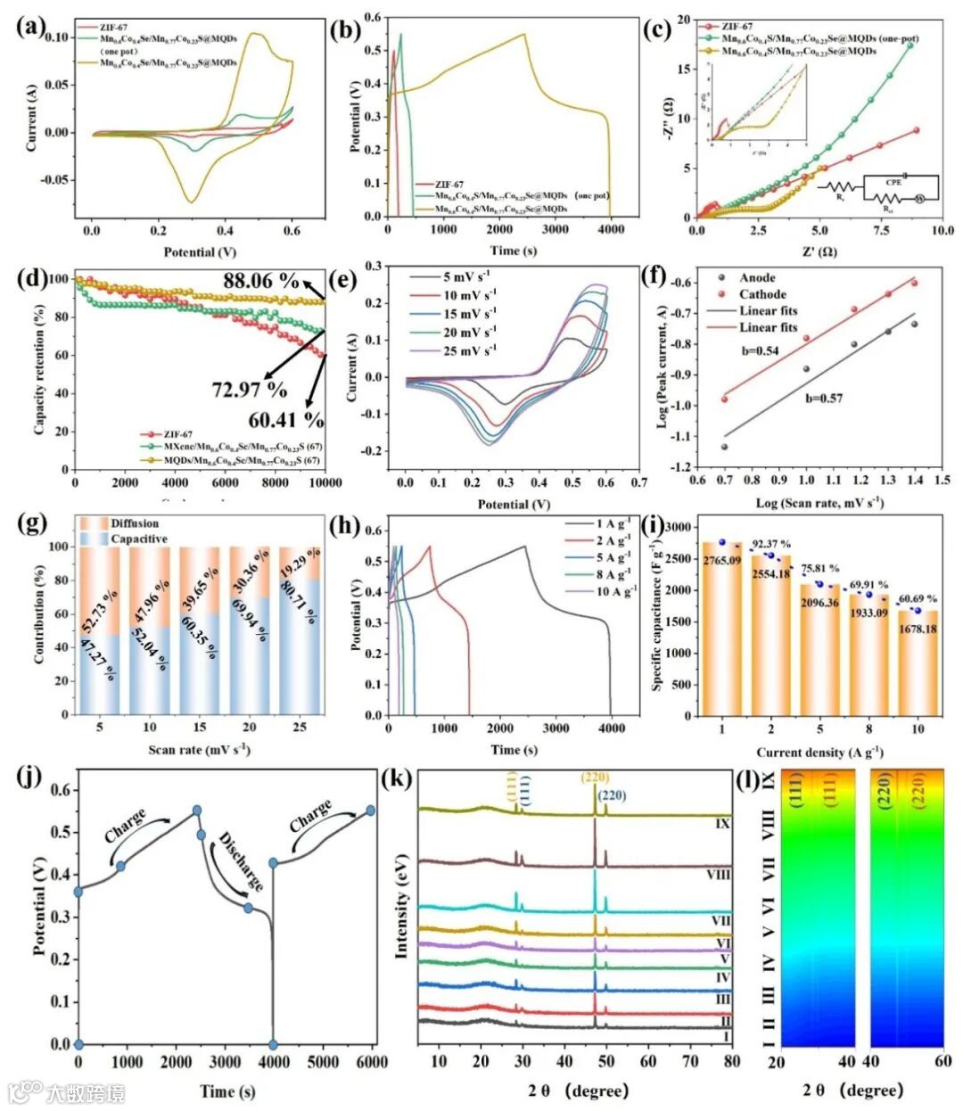 Fig.3 (a) CV curves for the ZIF-67, Mn0.6Co0.4Se/Mn0.77Co0.23S@MQDS (one pot) and Mn0.6Co0.4Se/Mn0.77Co0.23S@MQDS, (b) GCD curves at 1 A g−1 for different electrodes, (c) EIS spectra of various electrodes, (e) CV curves of Mn0.6Co0.4Se/Mn0.77Co0.23S@MQDS at various scan rates from 5 to 25 mV s−1, (f) The square root of peak current density versus square root of the scan rate for Mn0.6Co0.4Se/Mn0.77Co0.23S@MQDS, (g) The capacitive contribution to the total stored charge of Mn0.6Co0.4Se/Mn0.77Co0.23S@MQDS under various scan rates, (h) GCD curves of Mn0.6Co0.4Se/Mn0.77Co0.23S@MQDS in different current densities. The charge storage mechanism of Mn0.6Co0.4Se/Mn0.77Co0.23S@MQDS electrode based on the ex-situ characterization technique: (j) GCD plots labeled with various charge–discharge states. (k, l) XRD patterns at various charge-discharge states.