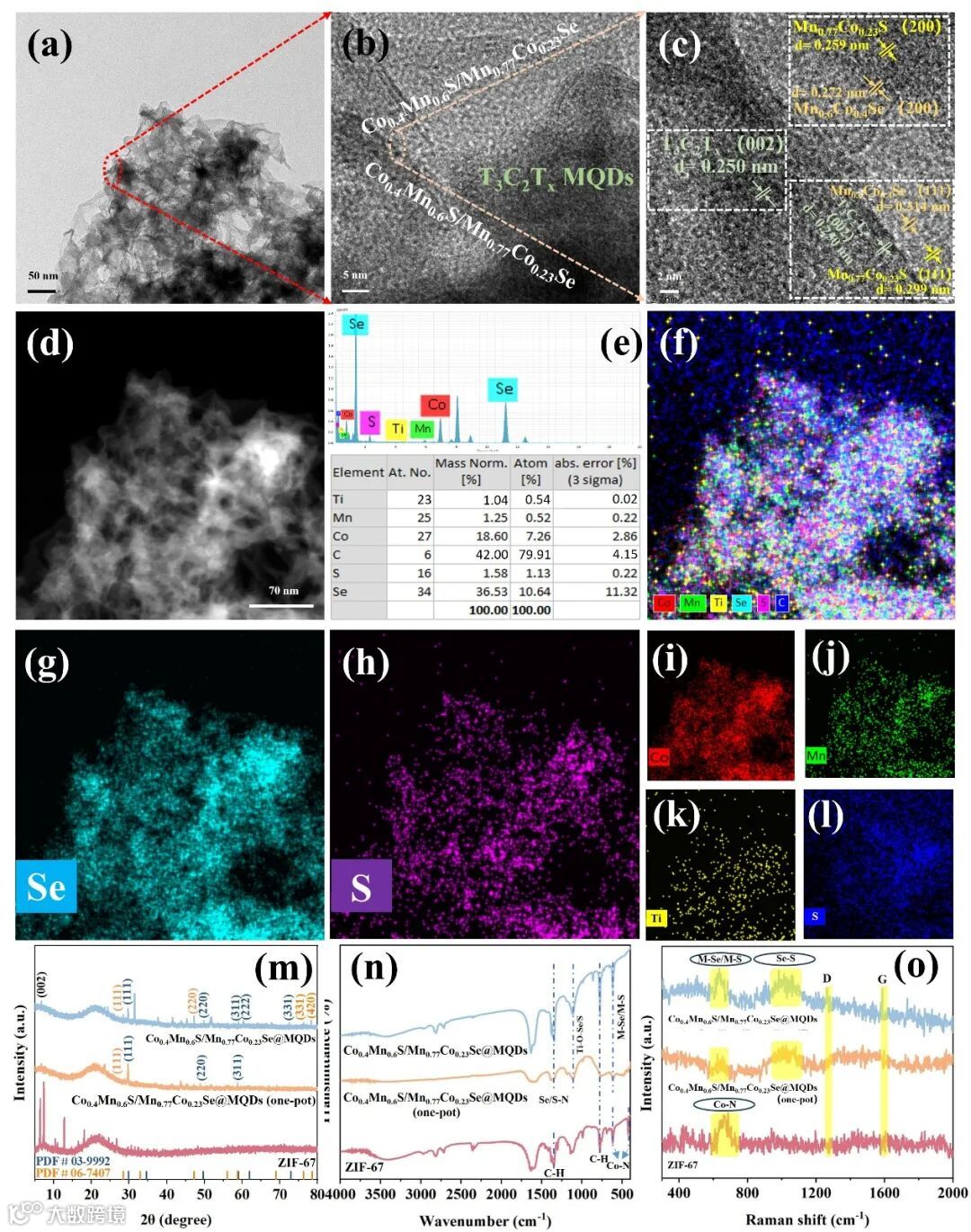 Fig. 2. (a,c) Transmission electron microscopy (TEM) of Mn0.6Co0.4Se/Mn0.77Co0.23S@MQDs at different magnifications, (e) EDS spectra of the samples, (f-l) EDS mapping images of the elements Co, Mn, Se, S, Ti and C, (m) XRD pattern of Mn0.6Co0.4Se/Mn0.77Co0.23S@MQDs and its Contrast Materials, (m) FT-IR spectra of samples, (o) Raman spectra of samples.