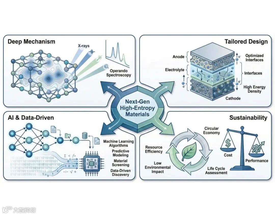 展望未来,高熵电池材料研究需要从“现象归因”转向“可验证的协同设计”,即在统一的操作性定义框架下,用混合法则基线与协同指数等量化标准去识别真实鸡尾酒效应,并通过严格的对照体系与可重复的合成路线排除单因素干扰;同时,应以原位和工况表征为核心,耦合多尺度计算与机理模型,厘清多元素在局域结构、缺陷化学、电子结构与界面膜演化中的分工与耦合关系,从而把协同增益落实为可迁移的结构和界面设计准则。在应用导向上,需要把容量、倍率、寿命与安全等多目标一体化优化,并将成本与关键元素依赖纳入前置筛选,推动以地壳丰度元素替代稀缺元素的高熵策略,同时建立标准化数据报告与开放数据库,结合机器学习与贝叶斯优化加速高维组分空间的筛选与反向设计,最终实现从实验室性能展示走向规模化可制造与工程化可落地的高熵电池材料体系。