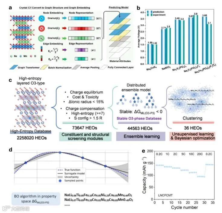 更进一步,综述把“落地实施”提升到可操作的策略与量化目标层面,并提出将成本与可持续性提前纳入组分筛选:尽量以Fe、Mn、Ti、Cr、Al、Mg等地壳丰度高的元素作为主体,仅在功能不可替代时少量使用Ru、Nb、Mo等关键元素,并建议用全生命周期评估去量化“复杂合成带来的额外消耗是否能被更长寿命抵消”。最后,综述强调面对高维组分空间,须引入数据驱动与高通量计算:高通量计算提供高质量训练数据与标准化数据库,机器学习擅长捕捉鸡尾酒效应这种非线性关系(如集成学习、图模型Battery Former、以及结合聚类与贝叶斯优化的筛选流程),从而实现从“直觉试错”到“可解释的多目标筛选与反向设计”的范式转变。