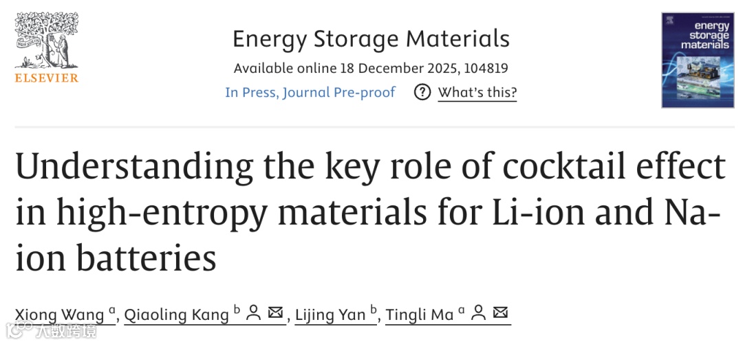 近日,来自中国计量大学的康巧玲与九州工业大学的马廷丽教授合作,在国际知名期刊Energy Storage Materials上发表题为“Understanding the key role of cocktail effect in high-entropy materials for Li-ion and Na-ion batteries”的综述文章。该文章把 “鸡尾酒效应”从其他高熵四大效应中区分出来,并提出可量化的判据来识别真正的非加和协同增益。基于这一操作性定义,系统梳理其在电池正极、负极与电解质等不同体系中的作用机制与证据链,进而提炼出可广泛应用的材料设计与优化策略。