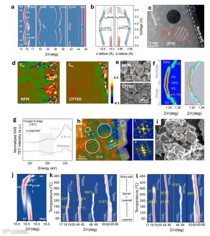 对正极材料,综述强调鸡尾酒效应的价值不只是“提高容量或电压”,而是兼顾层状氧化物等关键指标的:通过多元素协同强化M–O键、抑制层间与层内过渡金属迁移,从源头降低结构不可逆重排;同时“抑制”氧活性、抑制阴离子氧化还原触发的副反应,从而遏制尖晶石/岩盐等有害副相的成核与生长,并改善高电压下的气体析出起始电位与晶格应变。综述还明确指出,正极动力学瓶颈来自体相扩散、电子导电性、表面CEI增厚与表面重构等多因素叠加,鸡尾酒效应的优势在于能把这些因素“同步压低”,从而在高倍率与苛刻电压窗口下仍保持晶体结构。对锂体系,综述提出“锚定策略”更关键,即引入高价掺杂增强共价性、抑制氧释放与相变;对钠体系,则更强调用大半径或“支柱”离子来管理滑移与滞后相变,增加相变的可逆性。