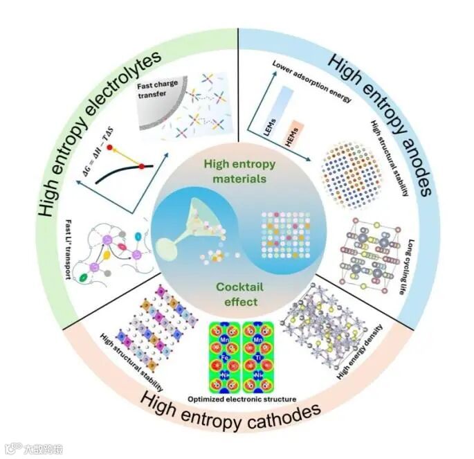 图1. 高熵正极、高熵负极和高熵电解质材料中鸡尾酒效应的应用示意图。