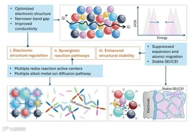 鸡尾酒效应归纳为三条主要机制:其一是电子结构调控,多元素协同改变费米能级附近态密度、带隙与电荷分布,从而提升本征电子导电性与电荷转移动力学;其二是协同反应路径,多元素提供多活性中心与多离子迁移通道,既能强化吸附与反应中间体转化,也能降低表面与体相扩散瓶颈;其三是增强结构稳定,多元素骨架分摊应变并缓冲体积变化,抑制原子迁移与不可逆重构,从而实现“高容量”与“长寿命”的协调。更重要的是,该综述把这三条机制作为贯穿负极、正极、电解质的统一规范,提出不仅要给出现象,还要对应到“哪条机制在起主导作用、是否存在机制间协同或互相抵消”。