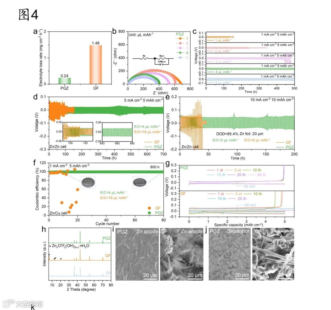 图 4. 贫瘠电解液下的电学性能测试。a) 不同隔膜的电解液损失率;b) 不同电解液用量下Zn/Zn对称电池的Nyquist图;c) Zn/Zn对称电池在不同 E/C 比和1 mA cm–2@5 mAh cm–2下的循环性能;d) Zn/Zn对称电池在5 mA cm–2@5 mAh cm–2(E/C=4μL mAh–1)下循环性能;e) Zn/Zn对称电池在10 mA cm–2@10 mAh cm–2(DOD=85.4%, E/C=2μL mAh–1)下的循环性能;f) Zn/Cu非对称电池在1 mA・cm–2@5 mAh cm–2下的库伦效率(CE);g) f图不同循环圈数下对应得比容量-电压曲线;h) 循环后锌负极的XRD图谱;循环后i)锌负极与j) 隔膜的SEM图。