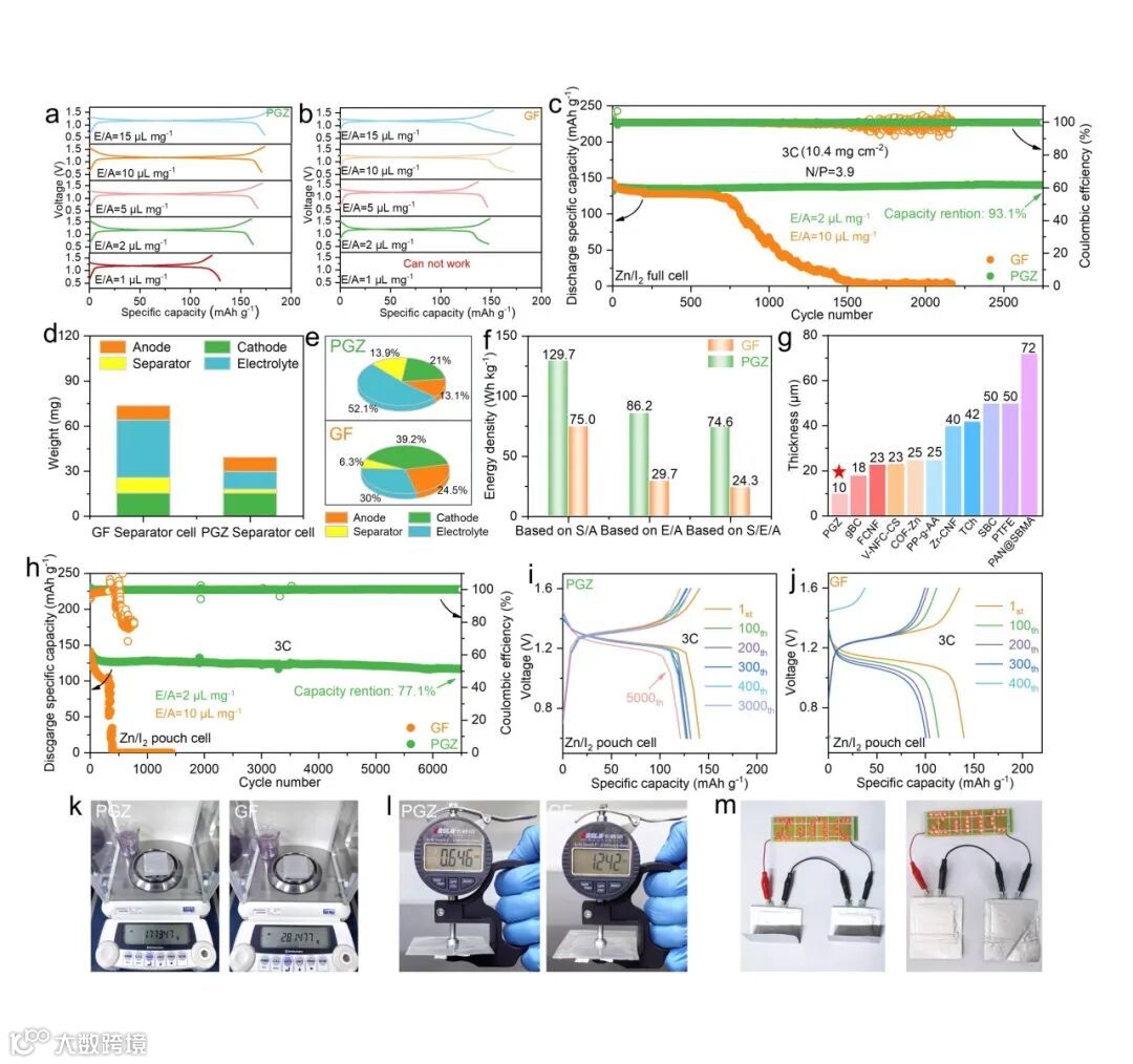 图 6. PGZ 隔膜在高能量密度水系锌离子电池中的实际应用。a)PGZ和b) GF隔膜组装的Zn/I₂全电池在不同E/A比下的充放电曲线;c) Zn/I₂全电池在低N/P(3.9)和3C倍率下的循环性能;Zn/I₂全电池中d) 主要组件的重量和e) 重量分数占比;f) Zn/I₂全电池基于不同计算基准下的质量和能量密度对比;g) PGZ隔膜与文献报道隔膜的厚度对比;h)Zn/I2软包电池在3C倍率下的长循环;采用i)PGZ和j)GF隔膜在不同循环圈数下对应的电压曲线;采用不同隔膜组装的Zn/I2软包电池的k)重量和i)厚度比较;m)PGZ隔膜组装的软包电池串联驱动显示“AZIBs”的LED显示屏。