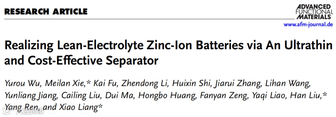 近日,南昌航空大学谢美兰、香港城市大学刘韩、湖南大学梁宵团队在国际知名期刊Advanced Functional Materials上发表题为“Realizing Lean-Electrolyte Zinc-Ion Batteries via An Ultrathin and Cost-Effective Separator”的研究论文。该文章设计了一种经济高效的超薄PGZ隔膜,该隔膜具有高的离子电导和优异的机械性能,且能适配贫电解液,超薄隔膜结合贫电解液对推进高能量密度AZIBs的发展至关重要。