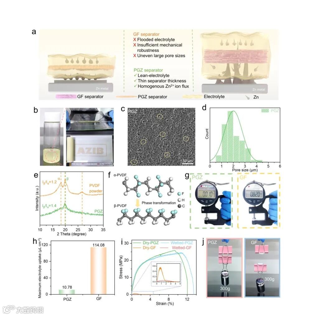 图1. PGZ 隔膜的制备及性能表征。a) PGZ隔膜减少电解液用量及均匀Zn2+流的示意图;b) 分散于NMP溶液中的PGZ浆料及大规模制备PGZ隔膜照片;c) PGZ隔膜的扫描电子显微镜(SEM)图;d) PGZ隔膜的孔径分布曲线图;e) PVDF粉末与PGZ隔膜的X射线衍射(XRD)图谱;g) 不同隔膜的厚度对比图;h) 不同隔膜的最大电解液吸收量;i) 干态和润湿状态下不同隔膜的应力–应变曲线;j) 不同隔膜悬挂300g重物的照片。