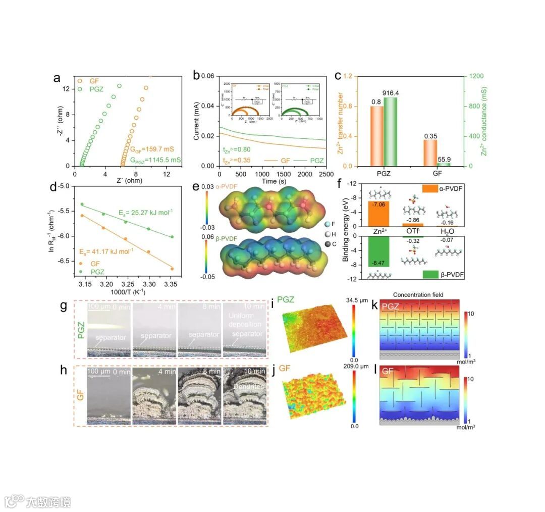 图2. PGZ隔膜的离子传输机制。a)不同隔膜的离子电导;b) 不同隔膜的时间-电流曲线及初始与稳态阻抗谱的插图;c) 不同隔膜的Zn2+迁移数与Zn2+电导对比;d) Arrhenius曲线及活化能计算结果;e) α-PVDF与β-PVDF重复单元的静电势(ESP);f) α-PVDF和β-PVDF与Zn2+、OTf–、H2O的结合能;g)PGZ和h) GF隔膜在15mA cm–2电流密度下锌沉积过程的原位光学观察照片;i)PGZ和j)GF隔膜中沉积的锌的超景深3D显微镜图像;k)PGZ和l)GF隔膜的COMSOL浓度场模拟结果。