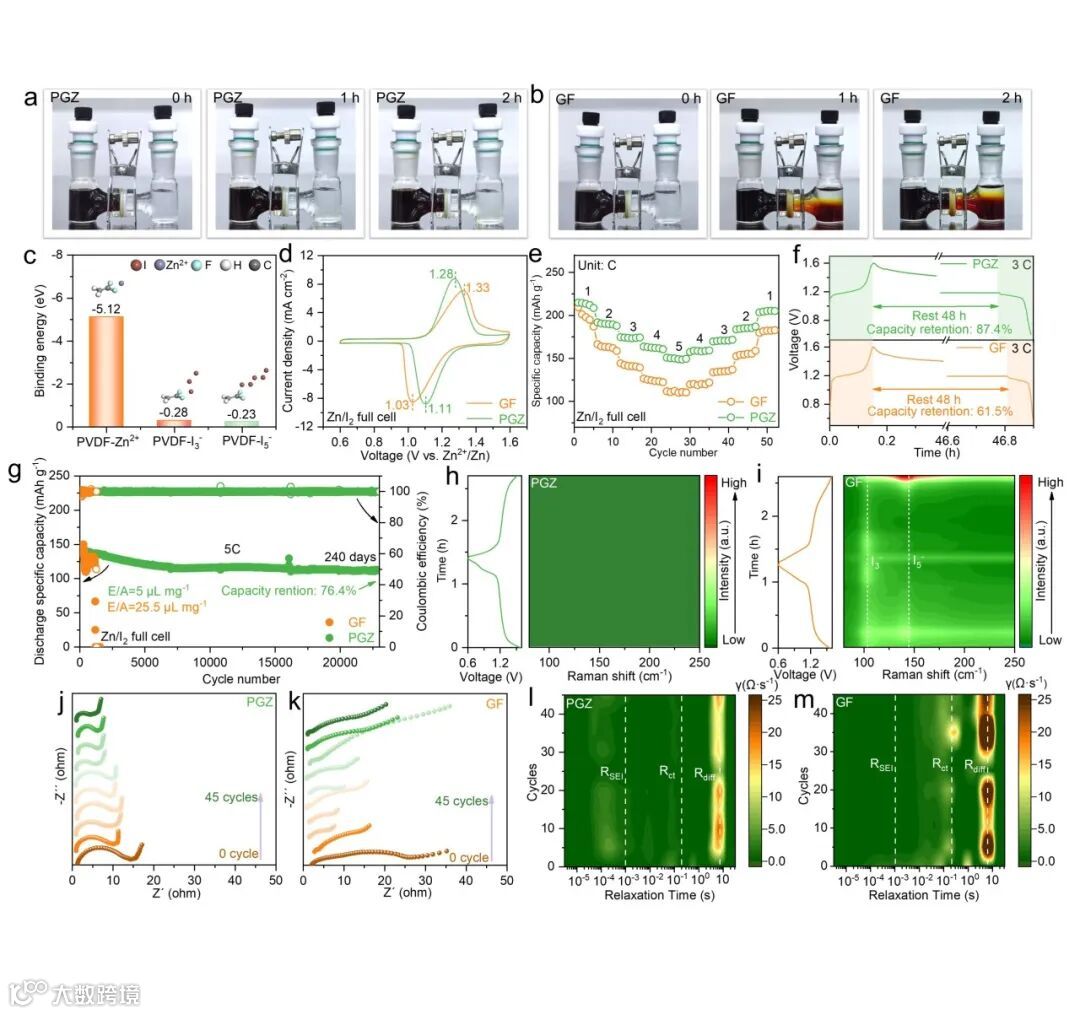 图 5. Zn/I₂全电池性能。a)PGZ和b) GF组装的H型电池的静态扩散实验图像;c) β-PVDF与Zn2+、I₃⁻、I₅⁻的结合能;d) Zn/I₂全电池在1 mV s–1下的CV曲线;e) Zn/I₂全电池的倍率性能测试;f) Zn/I₂全电池静置48 h后的自放电行为;g) Zn/I₂全电池在5C倍率下的循环性能;h) PGZ 和i) GF隔膜组装的Zn/I₂全电池在充放电过程中的原位拉曼图谱;j) PGZ 和k) GF隔膜组装的Zn/I₂全电池在不同循环次数的阻抗演化;l、m) 为对应的EIS解卷积得到的弛豫时间分布(DRT)图。