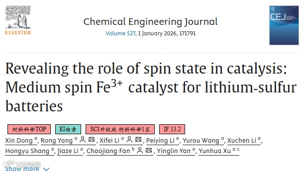 近日,来自西安理工大学的杨蓉教授,在国际知名期刊Chemical Engineering Journal上发表题为“Revealing the role of spin state in catalysis: Medium spin Fe3+ catalyst for lithium‑sulfur batteries”的研究文章。该工作通过NaBH4化学还原法在FeOOH中引入氧空位,成功将Fe3+的自旋态从低自旋调控至中自旋态。实验与理论计算表明,中自旋态Fe³⁺具有增强的自旋极化与更合适的d带中心位置,显著提升了硫还原反应的反应熵与动力学速率,进而实现了优异的倍率性能与长循环稳定性。