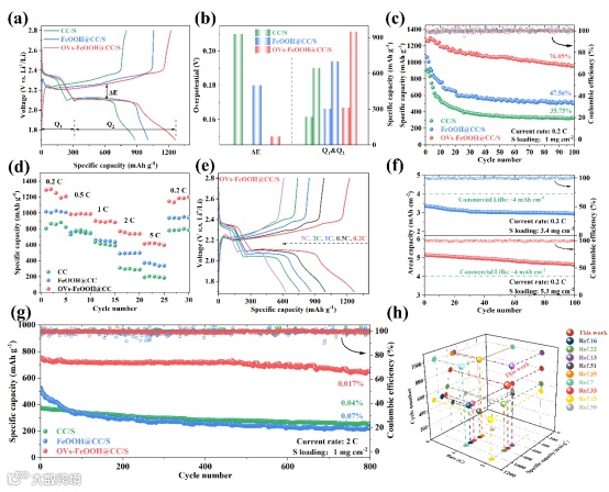 基于OVs-FeOOH@CC的锂硫电池实现了优异的综合电化学性能,充分体现了中自旋态Fe3+催化剂的优势。电池展现出卓越的倍率能力,在5 C高倍率下仍能提供613.34 mAh g-1的可逆容量,显著优于对照样品,这归因于自旋极化增强带来的快速反应动力学。长循环稳定性尤为突出,在2C电流密度下循环800周后,每圈容量衰减率仅为0.017%,体现了催化剂对多硫化物穿梭效应的持续有效抑制。此外,该电极在高硫负载条件下表现亮眼:当负载量提升至5.30 mg cm-2时,在0.2 C下仍能输出5.10 mAh cm-2的高面容量,且即使在8.10 mg cm-2的高负载与贫电解液条件下,面容量仍可达7.44 mAh cm-2,证明了其良好的电解液浸润性和离子传输网络。这些性能指标共同表明,通过自旋工程调控的OVs-FeOOH催化剂在提升锂硫电池能量密度、功率密度和循环寿命方面具有巨大的实际应用潜力。