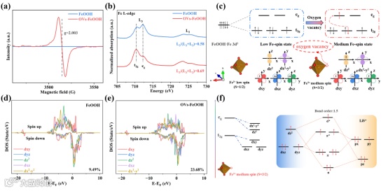 本研究通过缺陷工程在FeOOH中引入氧空位,诱导Fe3+活性中心发生自旋态转变。研究发现氧空位的形成破坏了FeOOH中Fe-O八面体的对称性,导致晶格膨胀(沿z轴方向Fe–O键长从1.77 Å增至1.90 Å),降低了晶体场分裂能(Δ),促使Fe3+从低自旋态转变为中自旋态,这一转变通过软X射线吸收谱、电子顺磁共振和理论计算得到证实。在软X射线吸收谱中,Fe L3边谱显示,OVs-FeOOH中t2g子带强度较高,而eg子带强度较低,表明eg轨道的占据率增加而t2g轨道的占据率下降。进一步根据Cramer's的研究发现,自旋态比率L3/(L3+L2)从FeOOH的0.58(低自旋)提高至OVs-FeOOH的0.69(中自旋)。