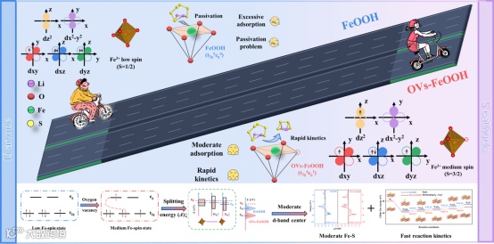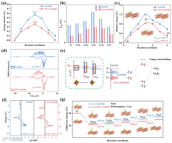 氧空位的引入能够使得OVs-FeOOH的能带变宽。因为能带宽窄不会影响总的能级数,所以形状会更加细长,而且金属中填充的电子数是不变的,,因此变宽后整个能带要下移来保持填充电子数不变,d带中心会随之下移。因此本工作中OVs-FeOOH获得比FeOOH更低的d带中心。因为d带中心下降,使得催化剂与Li2S4的反键轨道更低,自由电子需要更低的能量就能跃迁到反键轨道上,因此OVs-FeOOH表现出相比FeOOH更低的对Li2S4的吸附能力,而在本实验范围内,结合实验分析发现,这也是更合适的吸附能力。这种适中的吸附能力,完美遵循了催化中的“Sabatier原理”:它既能有效捕获多硫化物以抑制穿梭效应,又避免了因吸附过强而导致中间产物难以脱附或活性位点钝化。