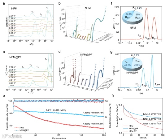 通过原位构筑 NaF/NaxPOy 异质结构正极电解质界面(CEI),正极表面形成了一层致密、连续且富含无机组分的稳定界面层。该异质结构界面通过强化 NaF 与磷酸盐组分之间的界面相互作用,有效抑制了 NaF 在酯类电解液中的溶解行为,显著降低了界面副反应。在充放电过程中,该稳定 CEI 能够避免界面反复破坏与重构,维持良好的化学与结构完整性,从而减少活性钠消耗和过渡金属迁移。同时,富无机组分的界面结构兼具较高的 Na⁺ 离子电导率和较低的电子导通性,有助于降低界面阻抗并促进 Na⁺ 传输动力学。受益于上述协同效应,改性正极表现出更高的初始库仑效率、更低的自放电速率以及显著提升的循环稳定性,并在长循环及软包全电池中均展现出优异的电化学性能。