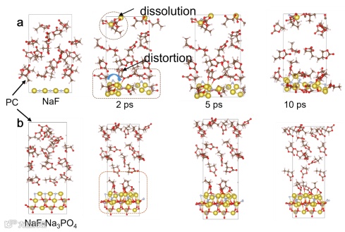 本研究通过实验表征与理论计算相结合,系统揭示了 NaF/NaxPOy 异质结构界面稳定 CEI 的内在机制。多尺度表征明确表明,异质界面能够通过强化界面键合与结构约束作用,有效抑制 NaF 在碳酸酯电解液中的溶解与界面重构;第一性原理分子动力学模拟进一步从原子尺度证实了磷酸盐组分对 NaF 结构的稳定作用,使界面失稳机理与性能提升之间形成清晰因果关联。