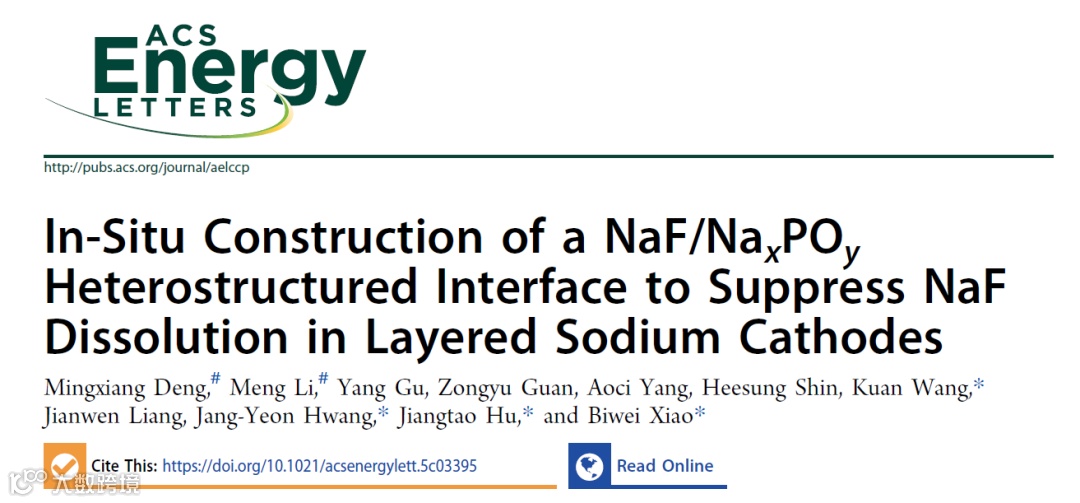 近日,来自深圳大学胡江涛授,汉阳大学Jang-Yeon Hwang教授和有研(广东)新材料技术研究院肖必威教授合作,在国际知名期刊ACS Energy Letters上发表题为“In-Situ Construction of a NaF/NaxPOy Heterostructured Interface to Suppress NaF Dissolution in Layered Sodium Cathodes”的观点文章。本研究通过引入环境友好型添加剂 Na₂PO₃F,通过简单的复烧工艺于 Na[Ni₁/₃Fe₁/₃Mn₁/₃]O₂ 正极表面原位形成稳定的 NaF/NaxPOy 异质界面层。多尺度结构表征与电化学测试表明,该异质结构 CEI 能有效抑制 NaF 溶解,减少副反应发生,显著提升正极材料的循环稳定性和界面动力学性能。同时,第一性原理分子动力学模拟从理论层面揭示了异质界面通过强化界面相互作用稳定 CEI 结构的内在机制。该研究为钠离子电池正极界面工程提供了一种可行且可推广的设计思路,对发展高稳定性、长寿命钠离子储能体系具有重要意义