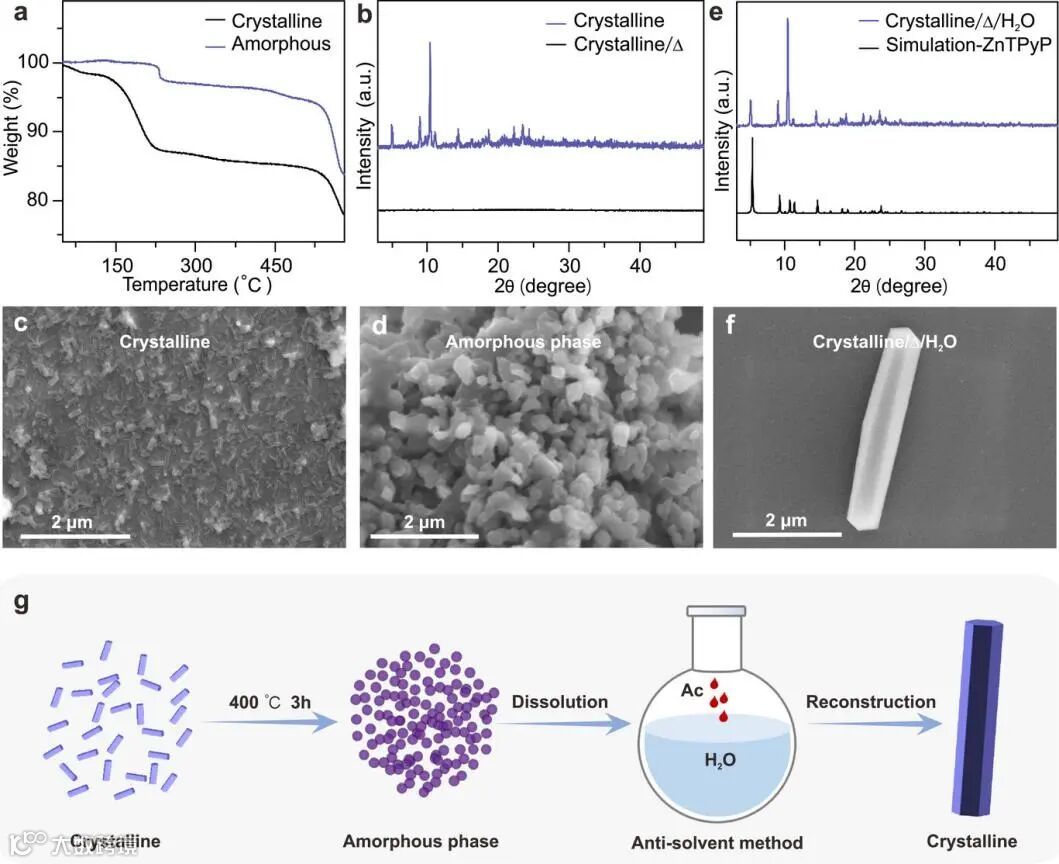图3.晶态MOF中水簇的关键结构稳定作用:脱水将导致框架从晶态向非晶态转变并伴随形貌扭曲,而再水化则能可逆恢复其原有晶格结构与形貌